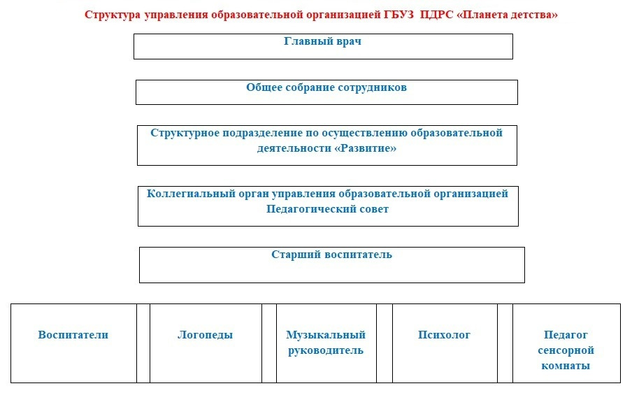 Формой коллегиального управления образовательной деятельностью является Общее собрание сотрудников учреждения и Педагогический совет, объединяющий всех педагогических работников ГБУЗ ПДС «Планета детства» и действующий в целях повышения профессионального мастерства воспитателей и педагогов коррекционно-развивающей службы.